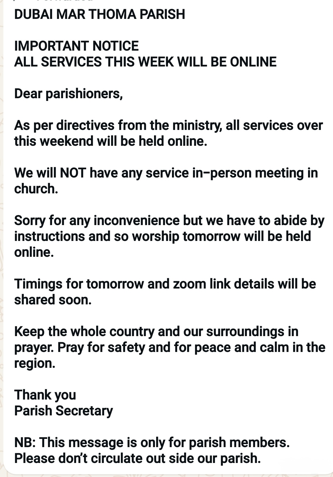 It was not long before the earnest worship of the Mar Thoma believers earned themselves the conviction and feeling of oneness to achieve their first milestone. A total of 130 eager Marthomites gathered in the "OUR OWN SCHOOL" building in Bur Dubai on 27th July 1969 and made a firm decision to stand together as a Mar Thoma Parish and framed the rules and regulations applicable based on the Mar Thoma Sabha Bharana Ghadna. The First team of office bearers of the Mar Thoma Parish, Dubai was unanimously elected in this formal meeting. The gathering was opened by the singing of the hymn "Ninte hitham polae enne nithyam nadatheedename..." And by the Lord's will, the Mar Thoma Parish Dubai grew from humble beginnings to a 5000-strong congregation, becoming one of the largest parishes in the Mar Thoma Syrian Church.